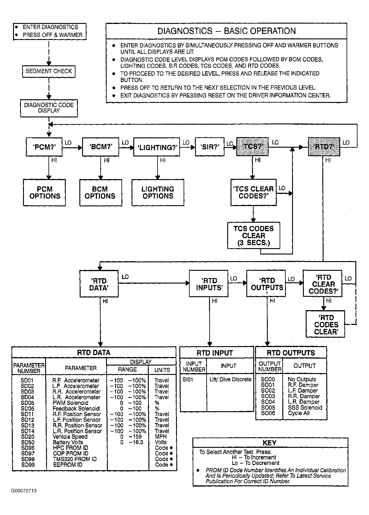 Diagnostic code level will display Powertrain Control Module (PCM) codes followed by Body Control Module (BCM) codes, lighting codes, Supplemental Inflatable Restraint (SIR) codes, Traction Control System (TCS) codes and RTD codes. See Fig 1 -Fig 6 . To proceed to desired level, press and release indicated CCP button(s). Depressing OFF button returns diagnostics to previous level. To exit diagnostics, depress RESET button on Driver Information Center (DIC). Proceed to appropriate diagnostic test procedure for displayed diagnostic codes.