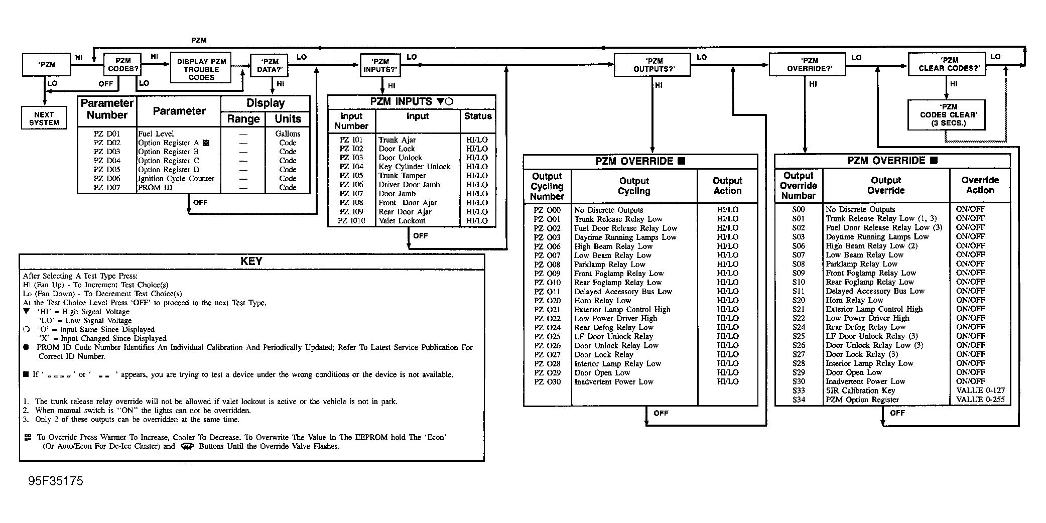 Following trouble code display, first available system will be displayed (i.e., PCM?, IPC?, ACM?, etc.). When selecting a system to test, any of following actions may be taken to control display: Pressing LO (fan down) button on CCP will display next available system selection (i.e., SDM?, TCS?, RSS?, PZM?, etc.). This allows display to be cycled through all system choices. List of systems can be repeated following end of system list. Pressing HI (fan up) button on CCP will select displayed system for testing (i.e., PZM DATA, PZM INPUTS, PZM OUTPUTS, etc.). See Figure . Pressing OFF button on CCP will stop system selection process and return display to beginning of PZM trouble code sequence.