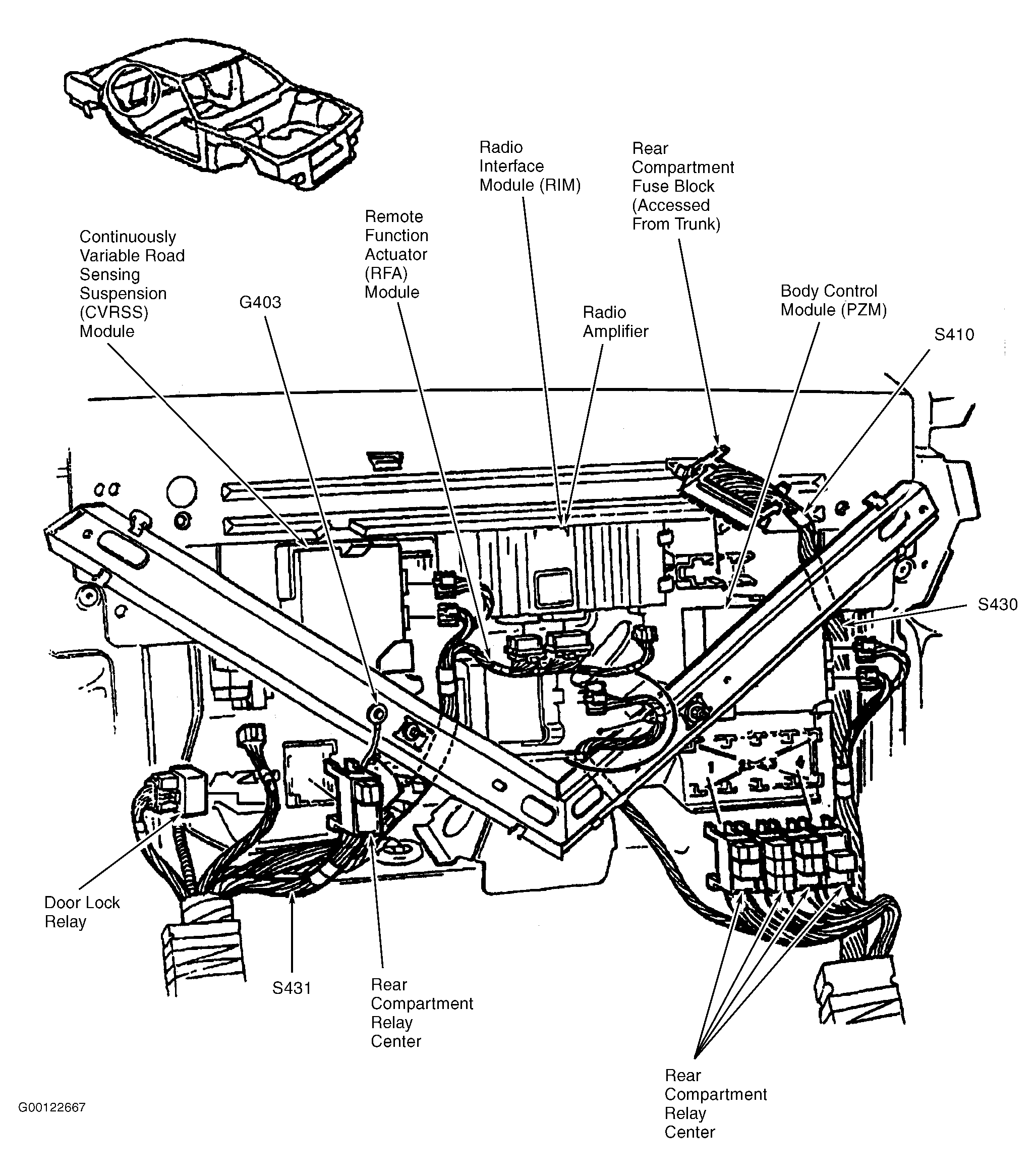 | Continuously Variable Road Sensing Suspension (CVRSS) Module | Front of rear compartment, attached to electronics bay. See Figure . |