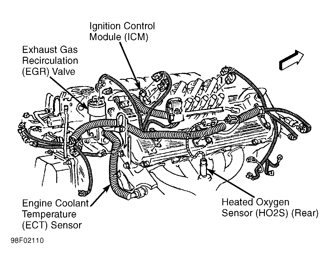 | Ignition Control Module (ICM) | At top right rear of engine, on cam cover. See Figure . |