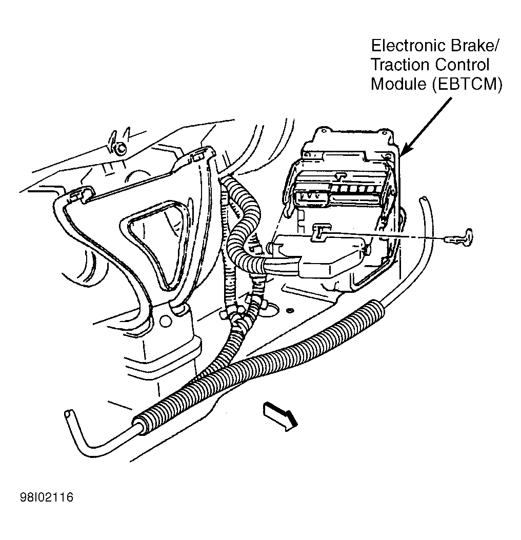 | Electronic Brake/Traction Control Module (EBTCM) | On left front corner of engine compartment, below air cleaner housing. See Figure . |