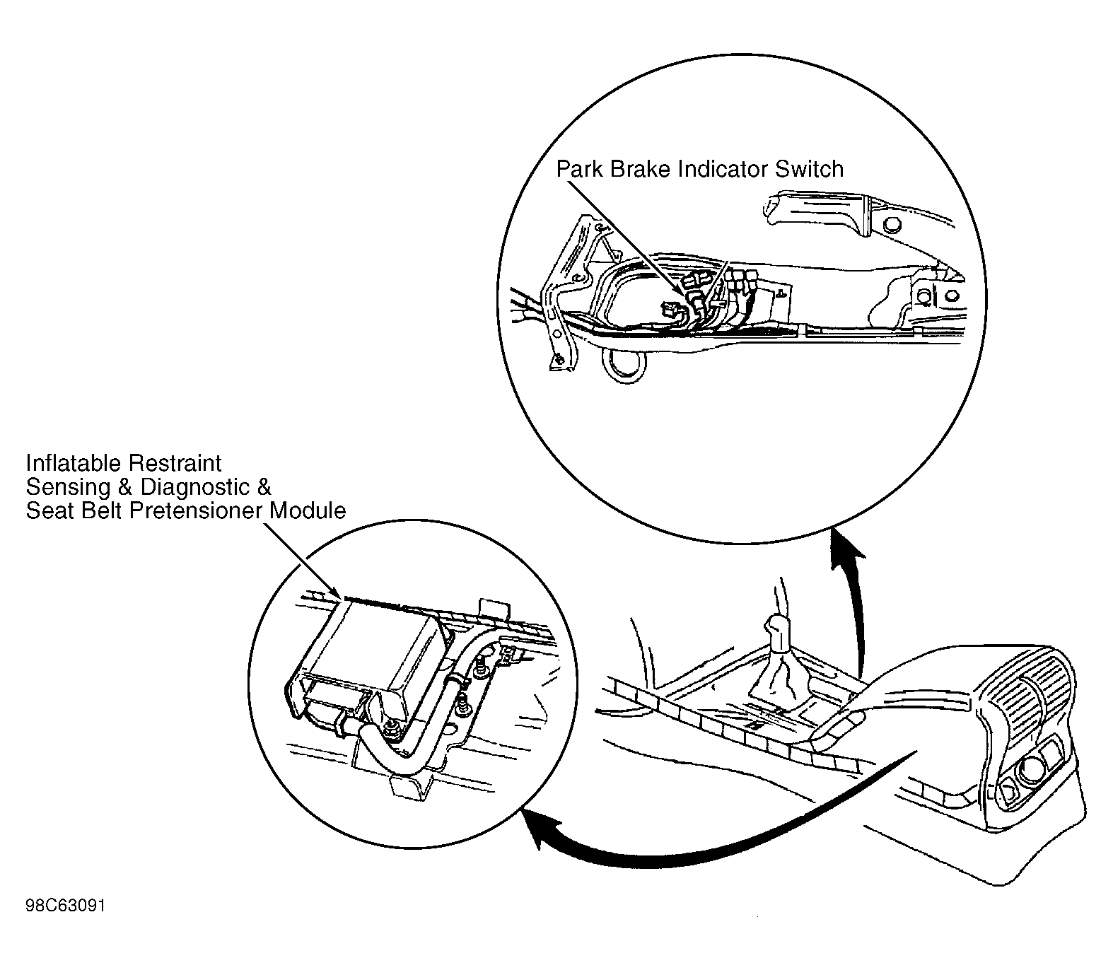 | Inflatable Restraint Sensing & Diagnostic & Seat Belt Pretensioner Module | Under center console, near parking brake lever. See Figure . |