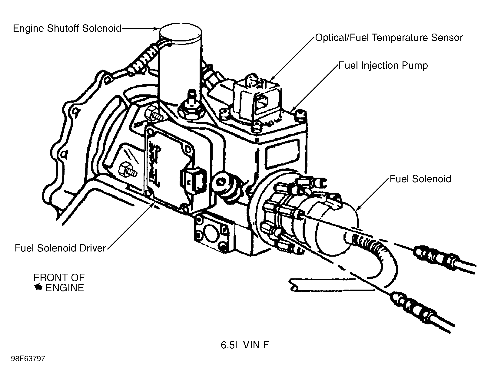 | Fuel Solenoid Driver (6.5L VIN F) | On left side of fuel injection pump. See Figure. |