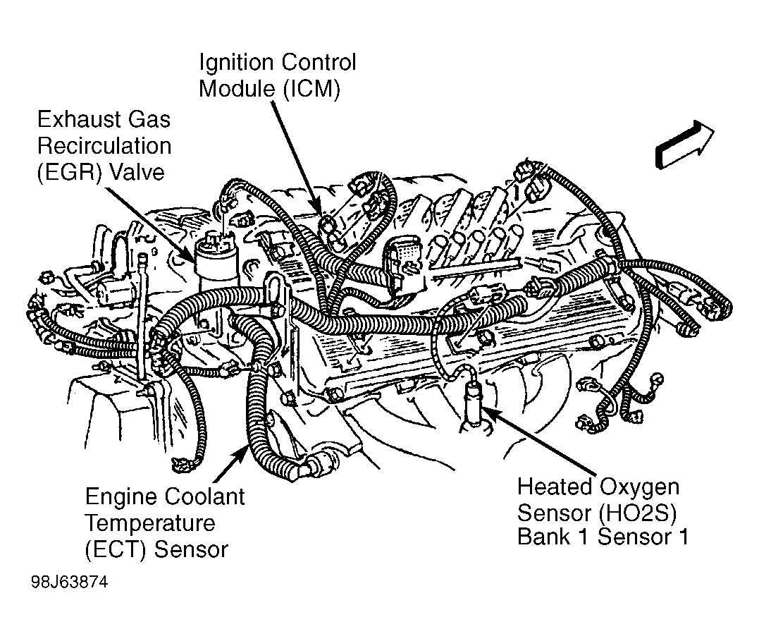 | Ignition Control Module (ICM) | At top right rear of engine, on cam cover. See Figure . |