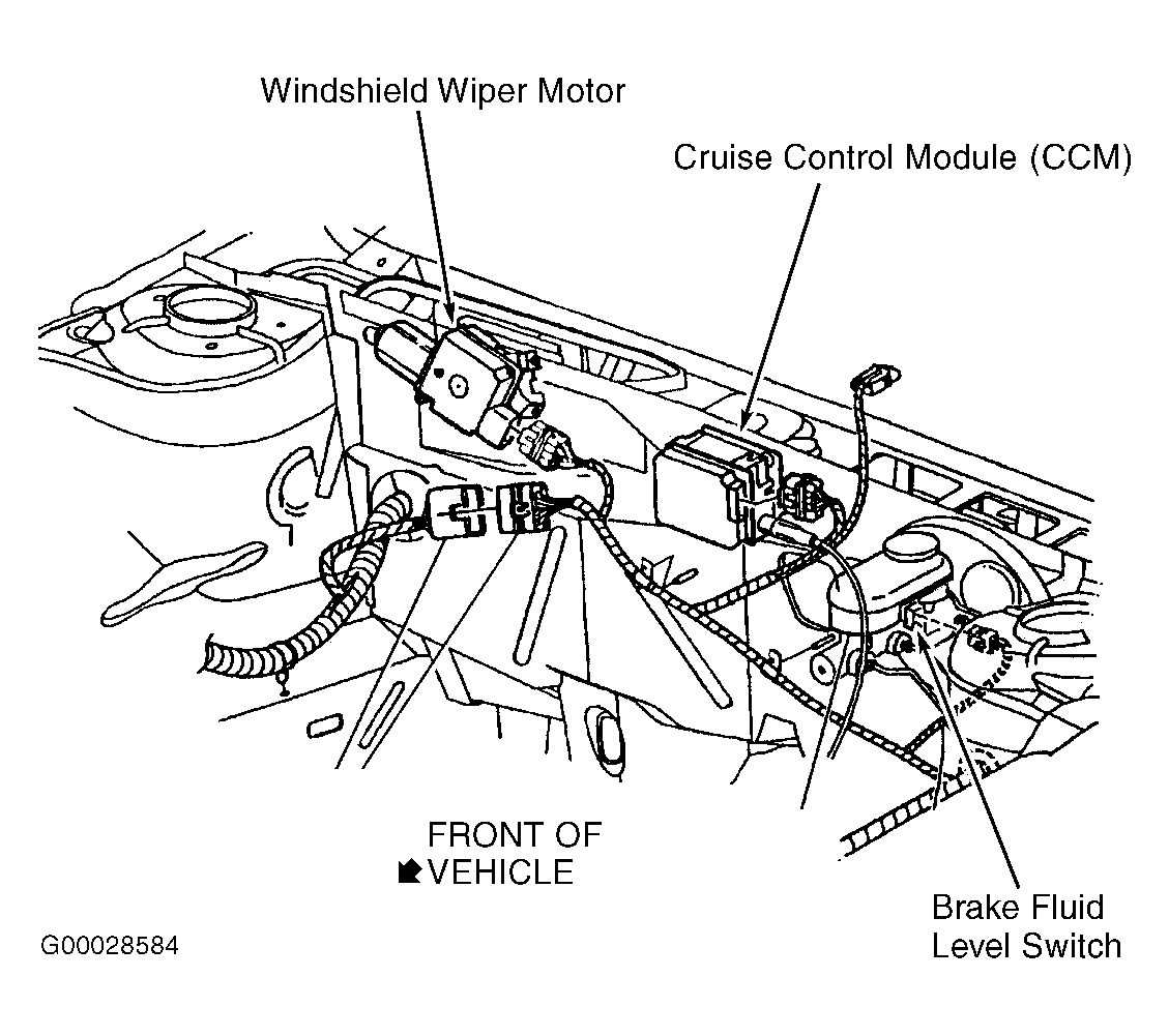 | Cruise Control Module (CCM) | On center rear of engine compartment, near power brake booster. See Figure . |