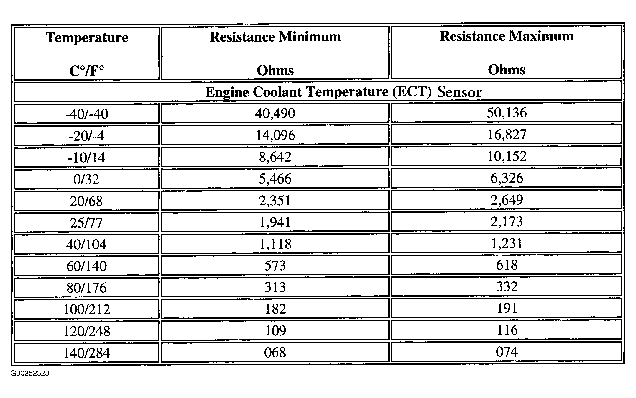 - Disconnect ECT sensor harness connector. Using DVOM, measure resistance of ECT sensor at specified temperatures. See Fig 1