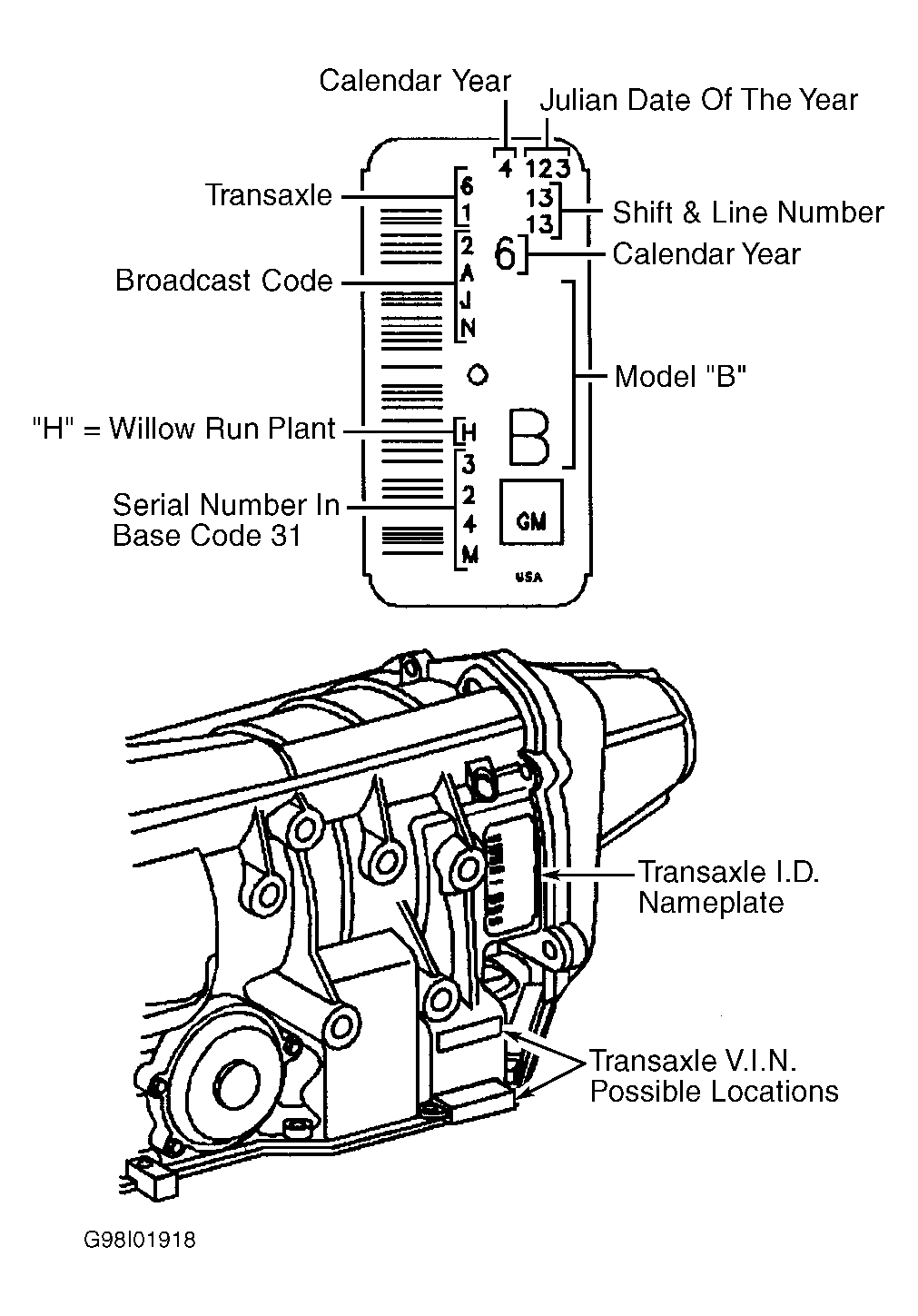 Transaxle has a metal identification plate or Service Replacement Transmission Assembly (SRTA) plate attached to rear face of transaxle. See Fig 1 . Transaxle RPO code is MH1.