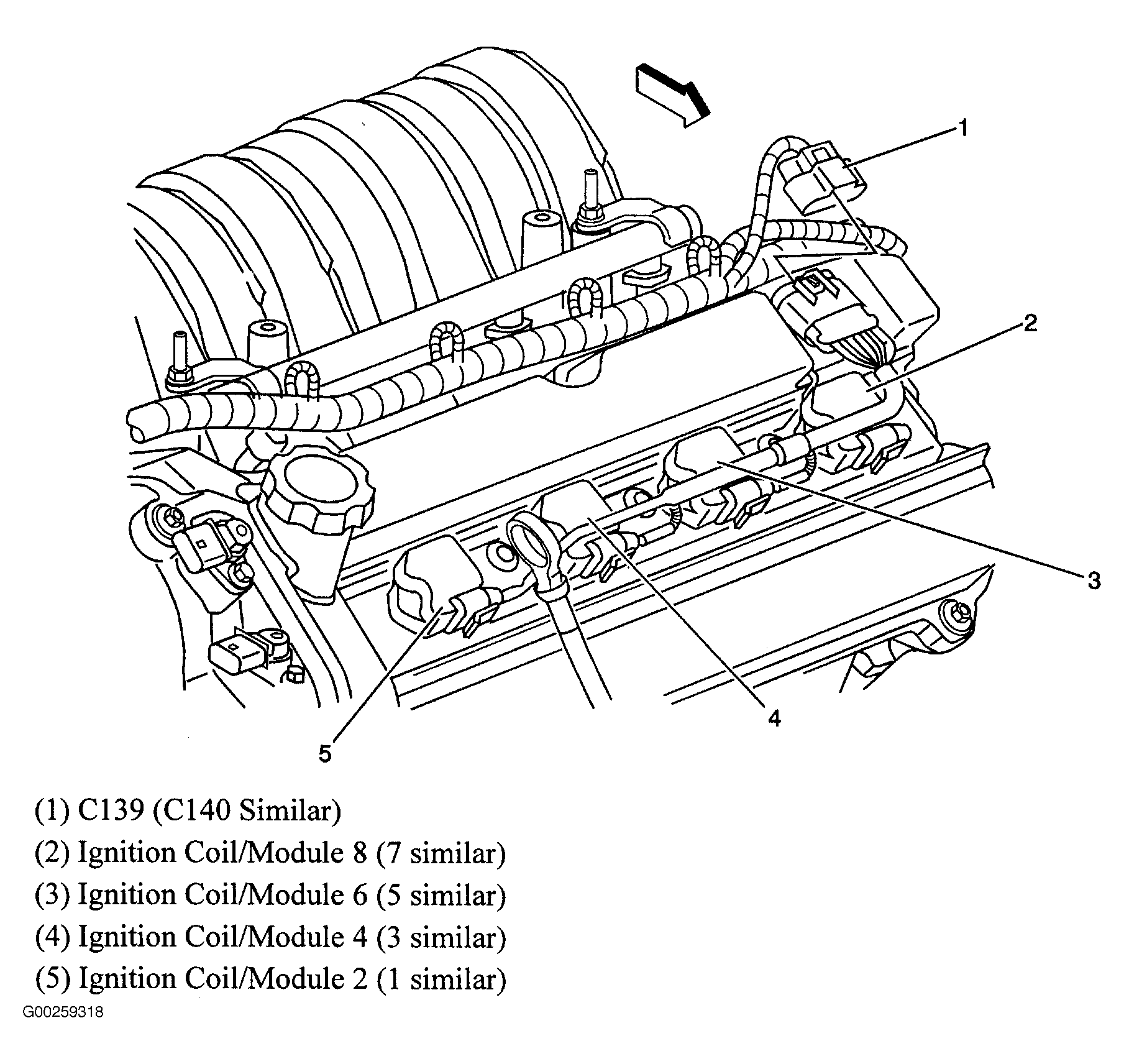 | Ignition Coil/Module 5 | Top rear of engine. See Figure . |