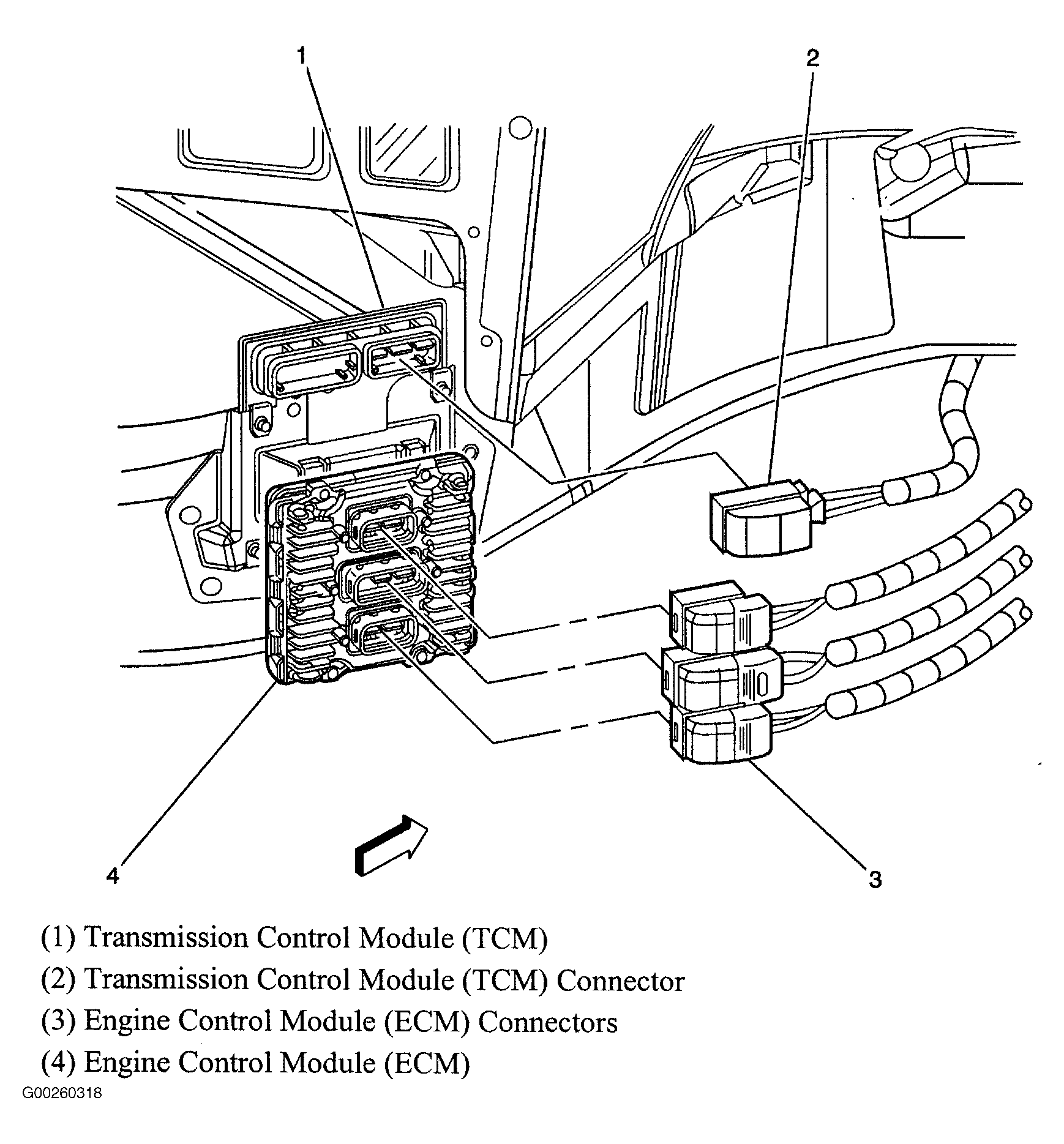 Transmission Control Module (TCM) Connector Lower right rear of engine compartment. See Figure .