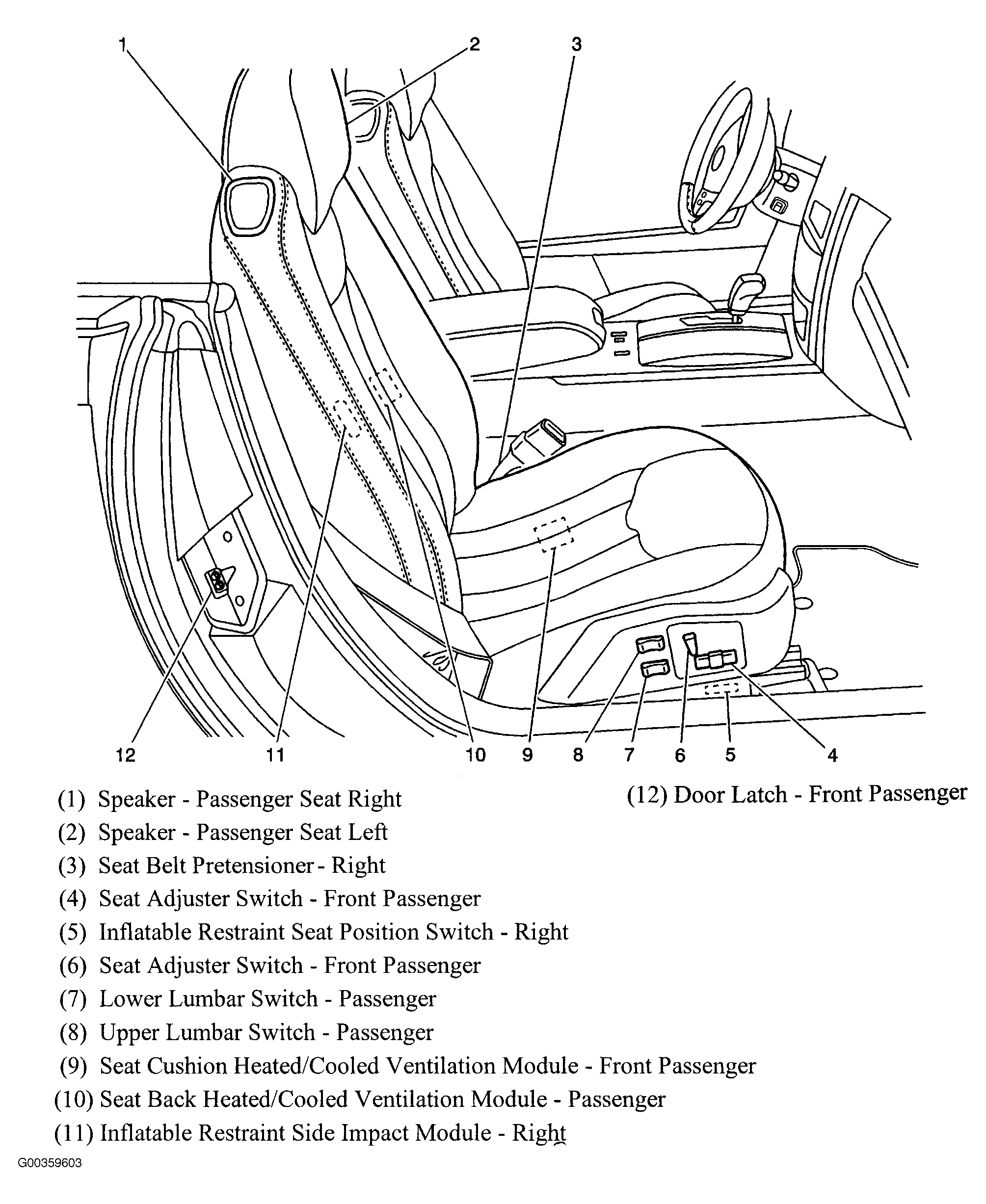 | Seat Back Heated/Cooled Ventilation Module - Passenger | At top of passenger seat back, between seat speakers. See Figure . |