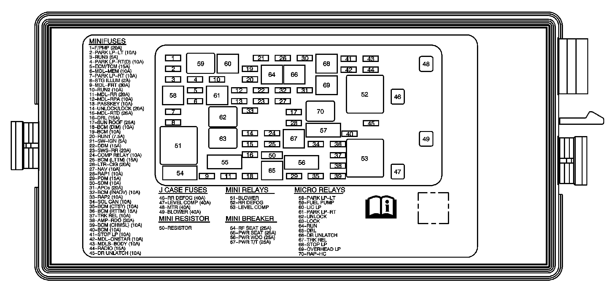 | Underhood Fuse Block | Right side of engine compartment. See Figure. |