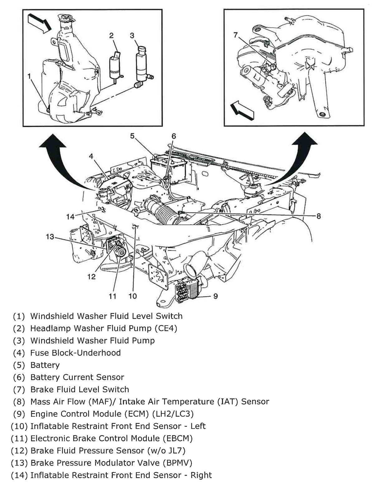 | Electronic Brake Control Module (EBCM) | Right front corner of engine compartment. See Figure. |