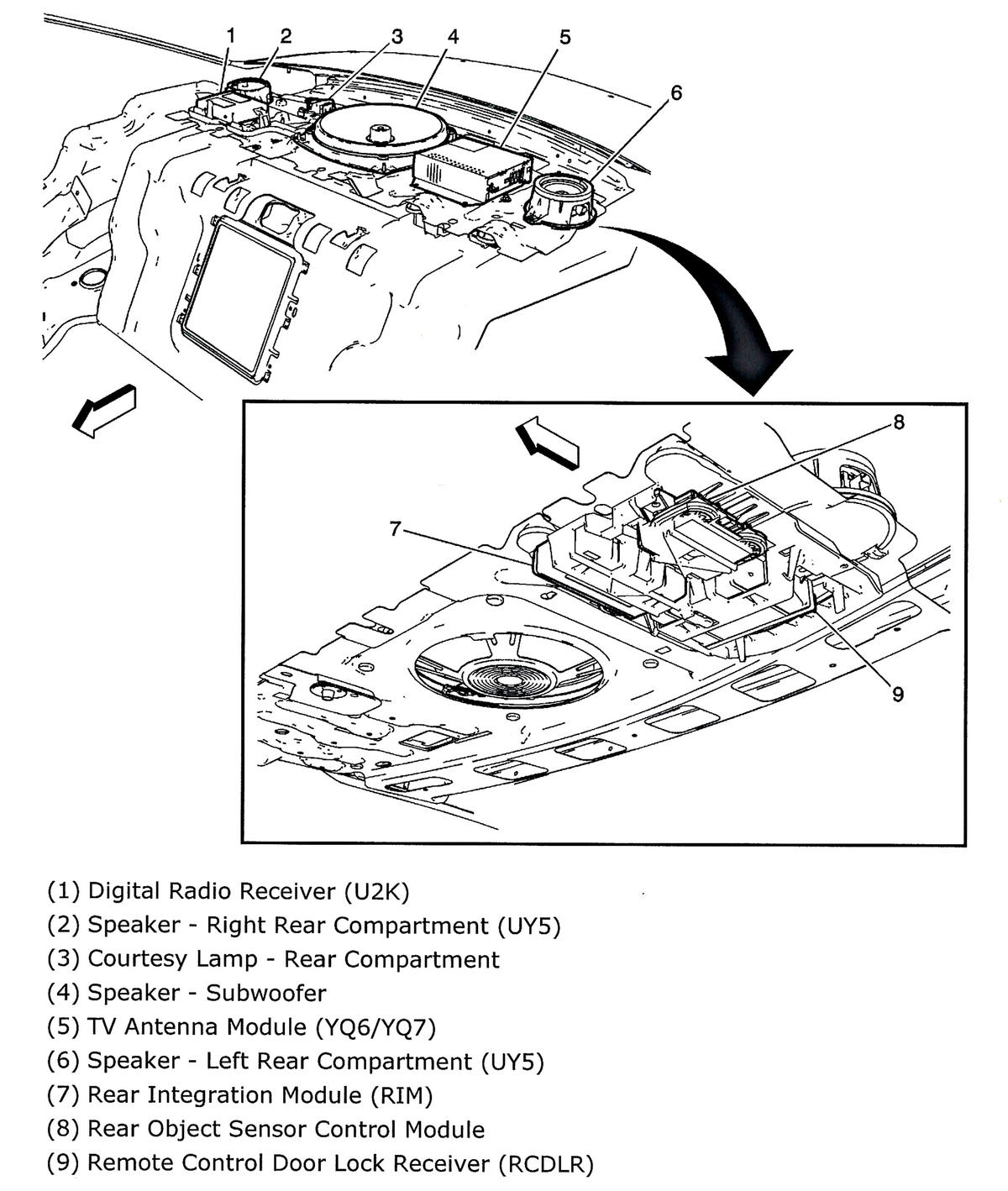 | Rear Object Sensor Control Module | In left side of rear compartment, under rear shelf. See Figure. |
