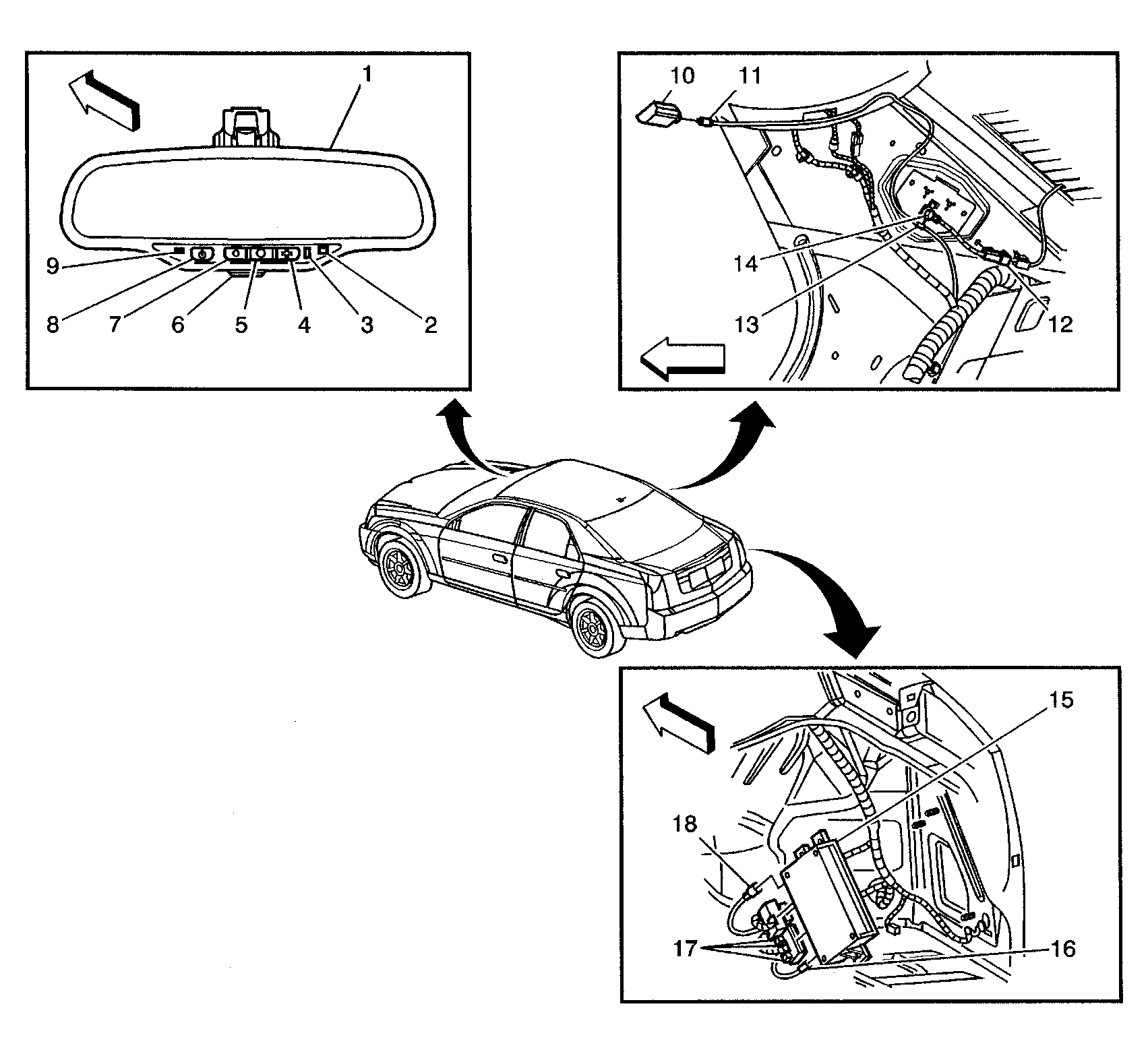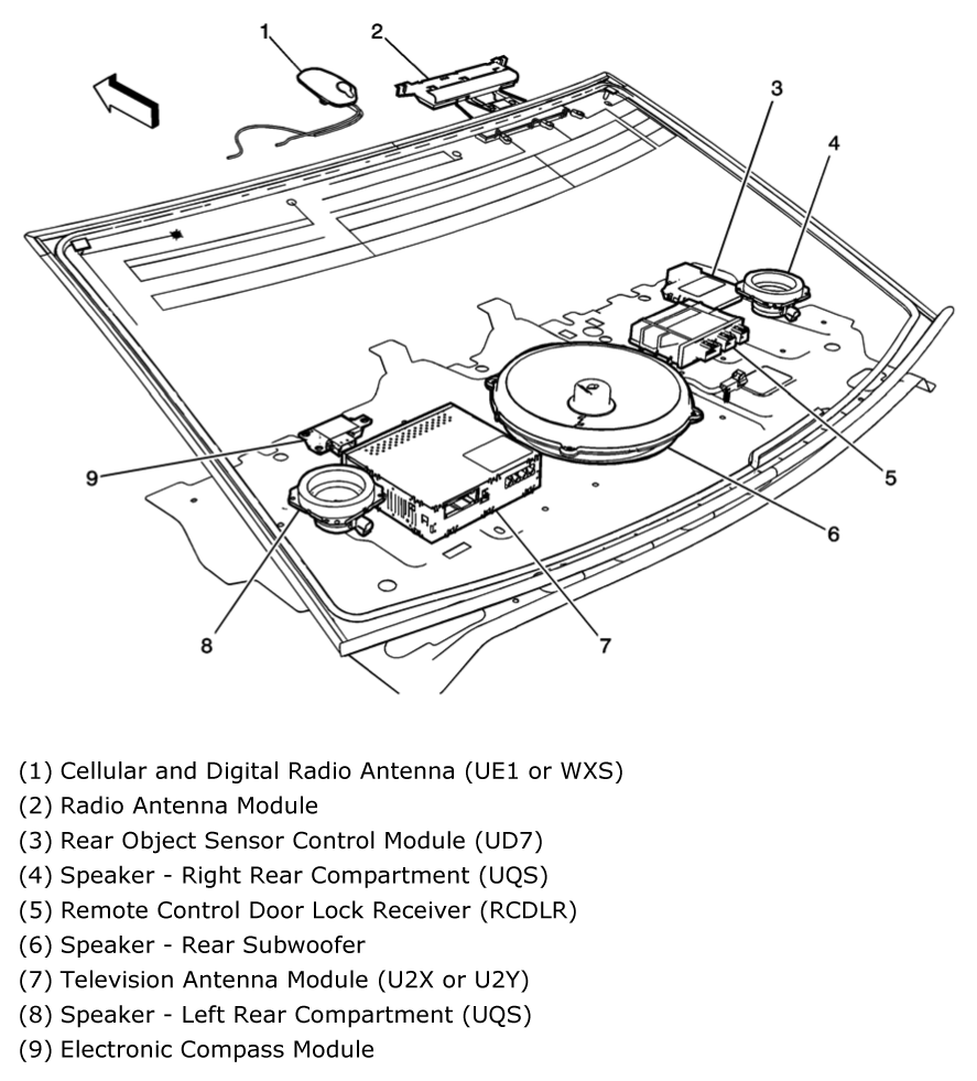 | Electronic Compass Module (Sedan) | Left side of rear shelf. See Figure. |