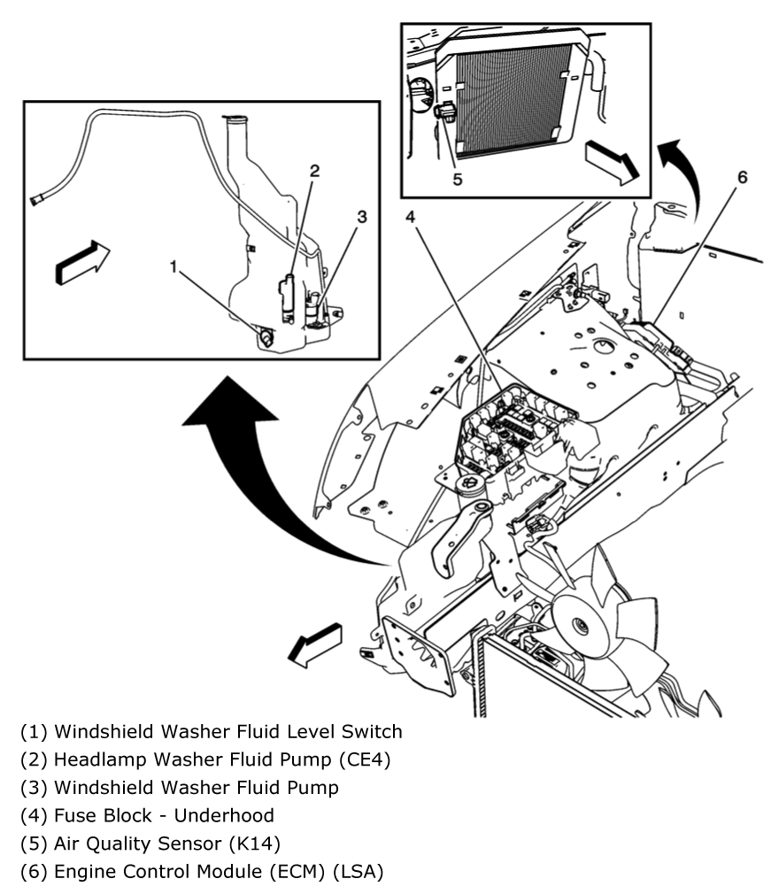| Windshield Wiper/Washer Module | Left rear of engine compartment. See Figure. |