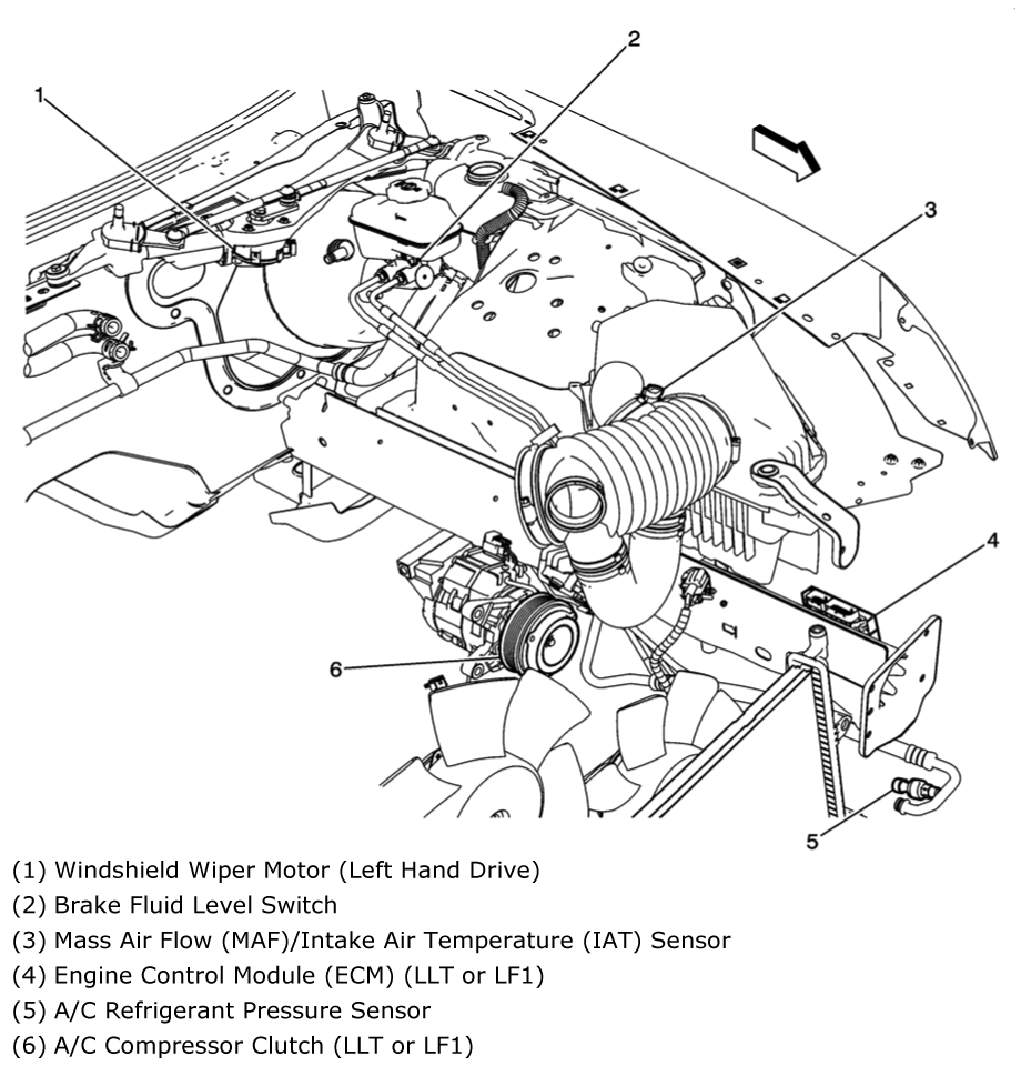 | Engine Control Module (ECM) (V6) | Left front of engine compartment. See Figure. |