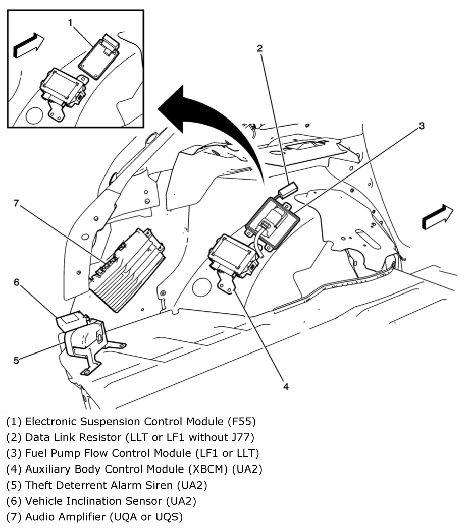 | Electronic Suspension Control Module | Left side of luggage compartment. See Figure. |