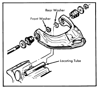 Adjust caster by realigning washers located between legs of upper control arm and locating tube. Always use 2 washers with a combined thickness of 0.472". If a 0.12" washer is installed at front and a 0.35" washer at rear, it will change caster + 1 °. If reversed with a 0.35" washer at front and a 0.12" washer at rear, caster will change -1°. See Fig 1.