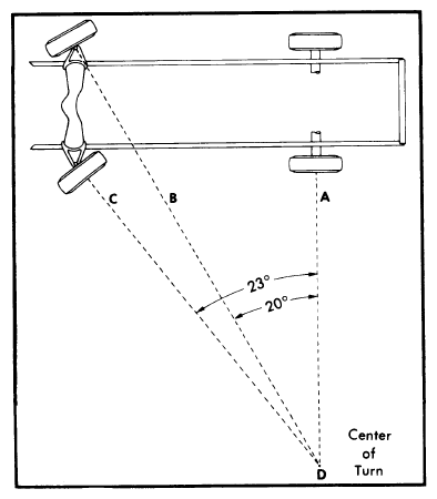 1. Toe-out is a check for bent or damaged parts, and not a service adjustment. With caster, camber, and toe-in properly adjusted, check toe-out with weight of car on wheels. See Fig 1.