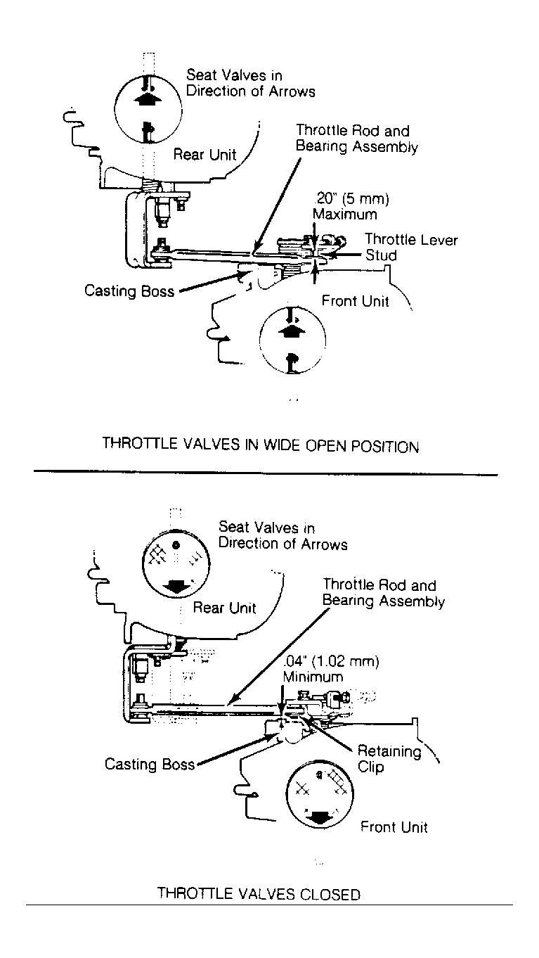 - Move both throttle levers through total travel and fully close throttle valves. Push throttle levers in direction of arrows. Measure clearance between throttle rod and front unit casting boss. Clearance must be .04" (1.02 mm) minimum. See Fig 1 .
