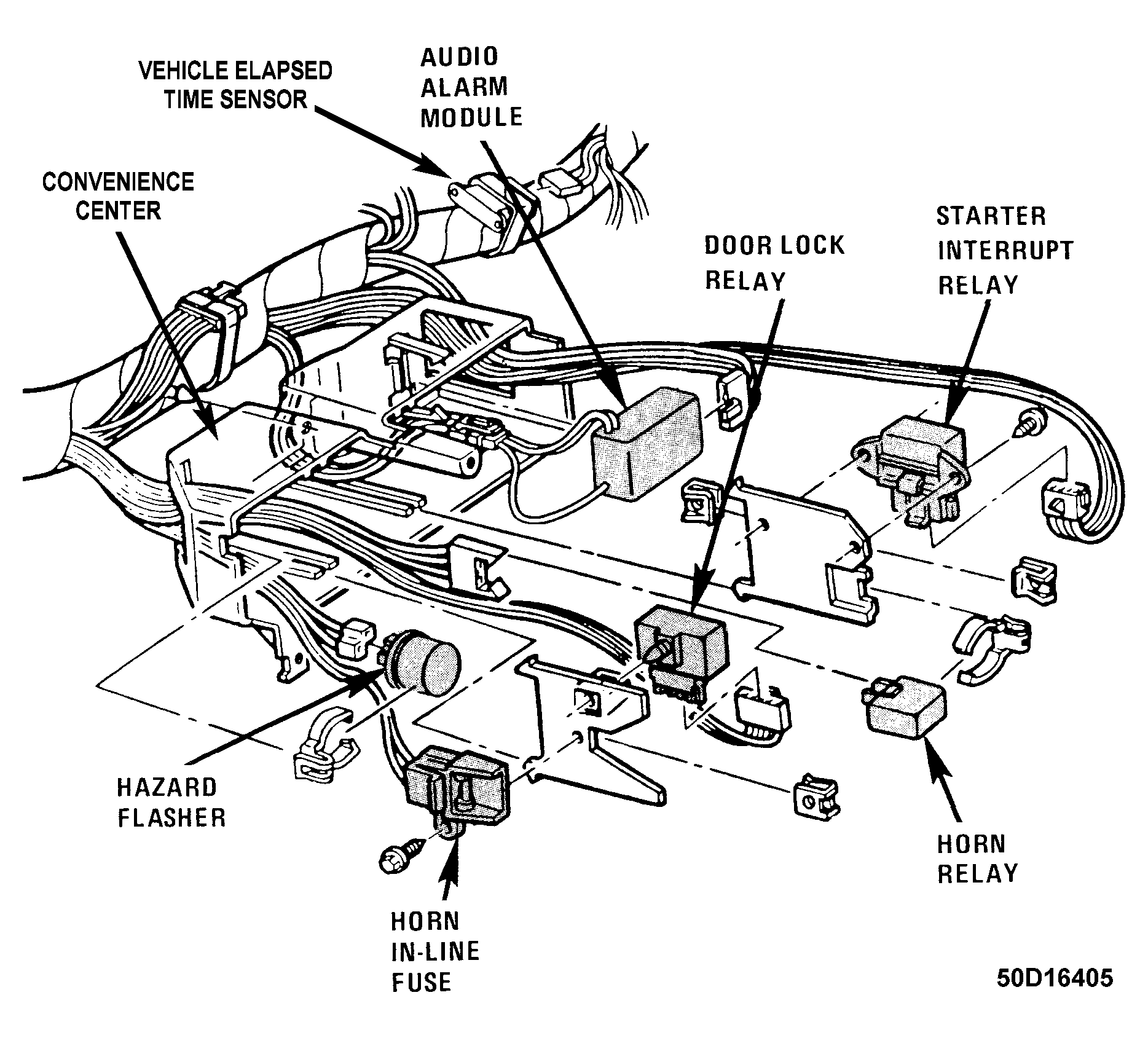 Audio Alarm Module Behind center of instrument panel. See Figure.