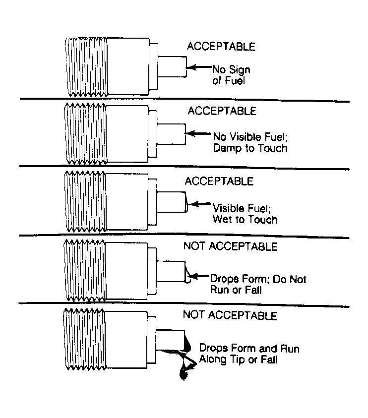 - Increase pressure to 150 psi (10 kg/cm2 ) BELOW actual opening pressure. Maintain pressure for 5 seconds. Compare fuel leakage to examples shown. See Fig 2 .