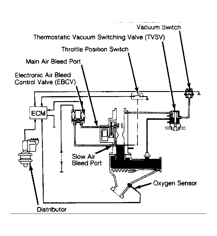 The ECM's output consists of a signal to an electric air bleed control valve (EBCV). When energized, the EBCV bleeds air into main air bleed circuit and into slow air bleed port of carburetor. This additional air leans air fuel ratio. When not energized, air fuel ratio moves to rich limit.