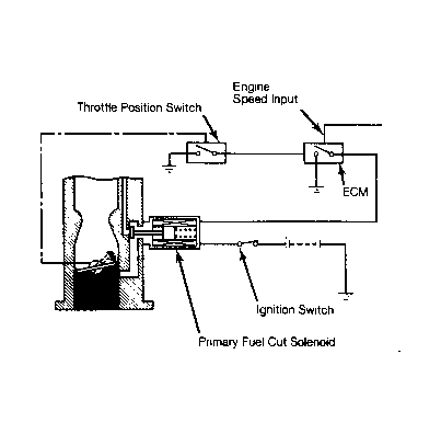 This system cuts off part of fuel flow in idle (or slow) circuit of carburetor preventing overheating and afterburning in exhaust system. The first fuel cut solenoid is kept energized by the ECM whenever engine is running, except when throttle is closed with RPM above 2290. This condition will be sensed by ECM when throttle position switch opens as throttle closes.