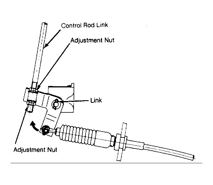 Loosen adjustment nuts at control rod link. With transaxle in Neutral detent, place selector lever in "N". Rotate link assembly clockwise to remove slack in cable. Tighten rear adjustment nut until it makes contact with link, then tighten front adjustment nut until it makes contact with link. See Fig 1 .