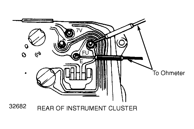 - To test gauge, use an ohmmeter to measure coil resistance. Attach ohmmeter probes across FU and E terminals on back of instrument panel at fuel gauge. See Figure . Correct resistance is 55 ohms.