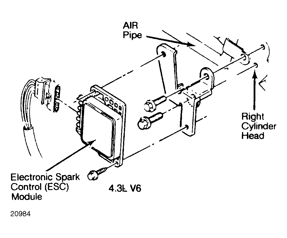 | Elect. Spark Cntrl. (ESC) Module (4.3L) | On bracket at rear of right cylinder head. See Figure. |