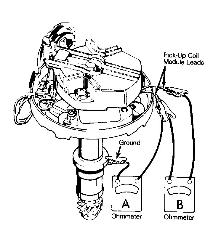 - Connect vacuum pump to vacuum advance unit. If vacuum unit is inoperative, replace unit. Remove pick-up coil connector (Green and White wires) from electronic module. Connect ohmmeter leads to either pick-up coil lead and to distributor housing. See "A" in Fig 1. Set ohmmeter in middle scale. Operate vacuum advance throughout vacuum range. Reading should be infinite at all times.