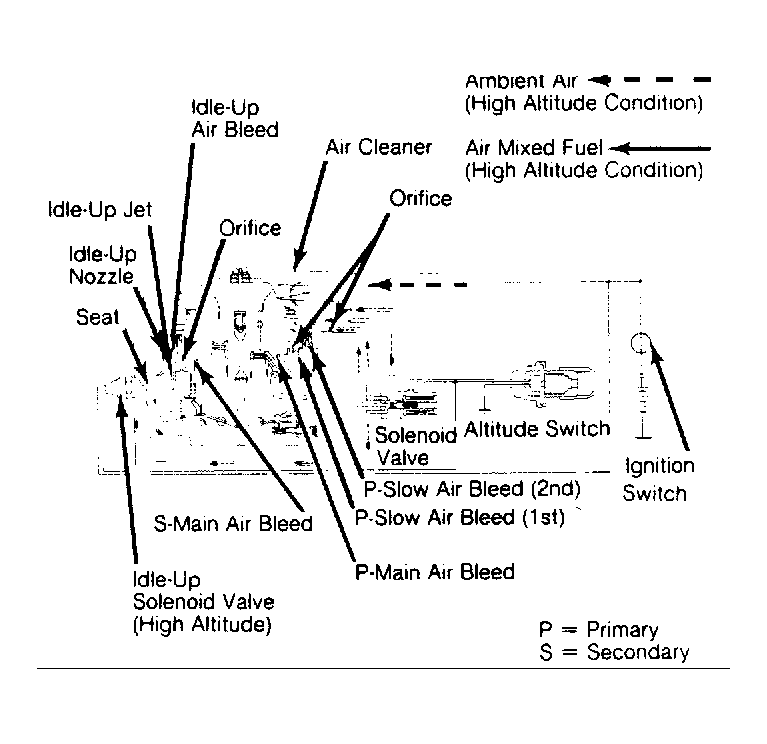 Solenoid valve opens a passage between air cleaner and carburetor. Fresh air will then pass through 3 main metering orifices and be supplied to idle and off idle systems in addition to primary and secondary main metering systems. The high altitude idle-up solenoid valve will open a passage to a port located downstream of throttle valve. Additional air/fuel mixture will be supplied to engine, permitting stable idle RPM at high altitude. See Fig 1 .