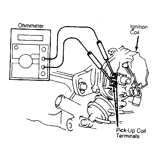 Turn ignition off. Remove distributor cap and cover. Measure pick-up coil resistance across terminals. See Fig 1. Resistance should be 140-180 ohms. If not, replace pick-up coil.