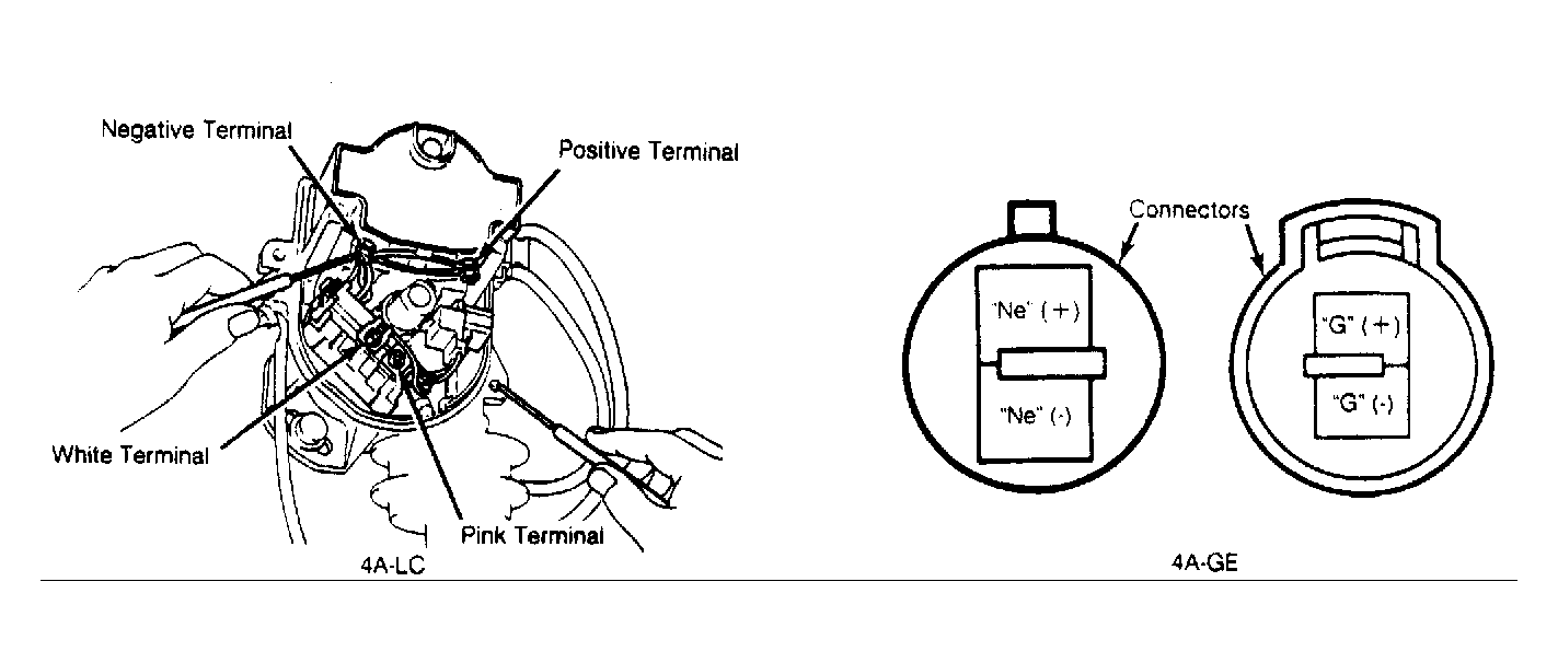 Turn ignition off. Remove distributor cap. Disconnect electrical connector from pick-up coil to module. Check resistance across positive and negative pick-up coil (connector terminals on 4A-GE models) terminals, using an ohmmeter. See Fig 1. Resistance (cold) should be 140-180 ohms. If resistance is not as specified on 4A-LC models, replace pick-up coil and breaker plate. If resistance is not as specified on 4A-GE models, replace distributor.