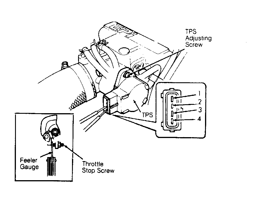 - Disconnect TPS harness connector and check continuity across TPS terminals. Check that continuity exists between terminals No. 3 and 4 when throttle is at idle. No continuity should exist at wide open throttle. See Fig 1