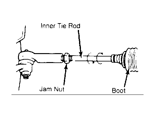 Loosen jam nut on inner tie rod. Adjust toe to specification by turning inner tie tie rod. Do not twist boots (if equipped). Tighten nuts to 45 ft. lbs. (61 N.m). See Fig 1 .