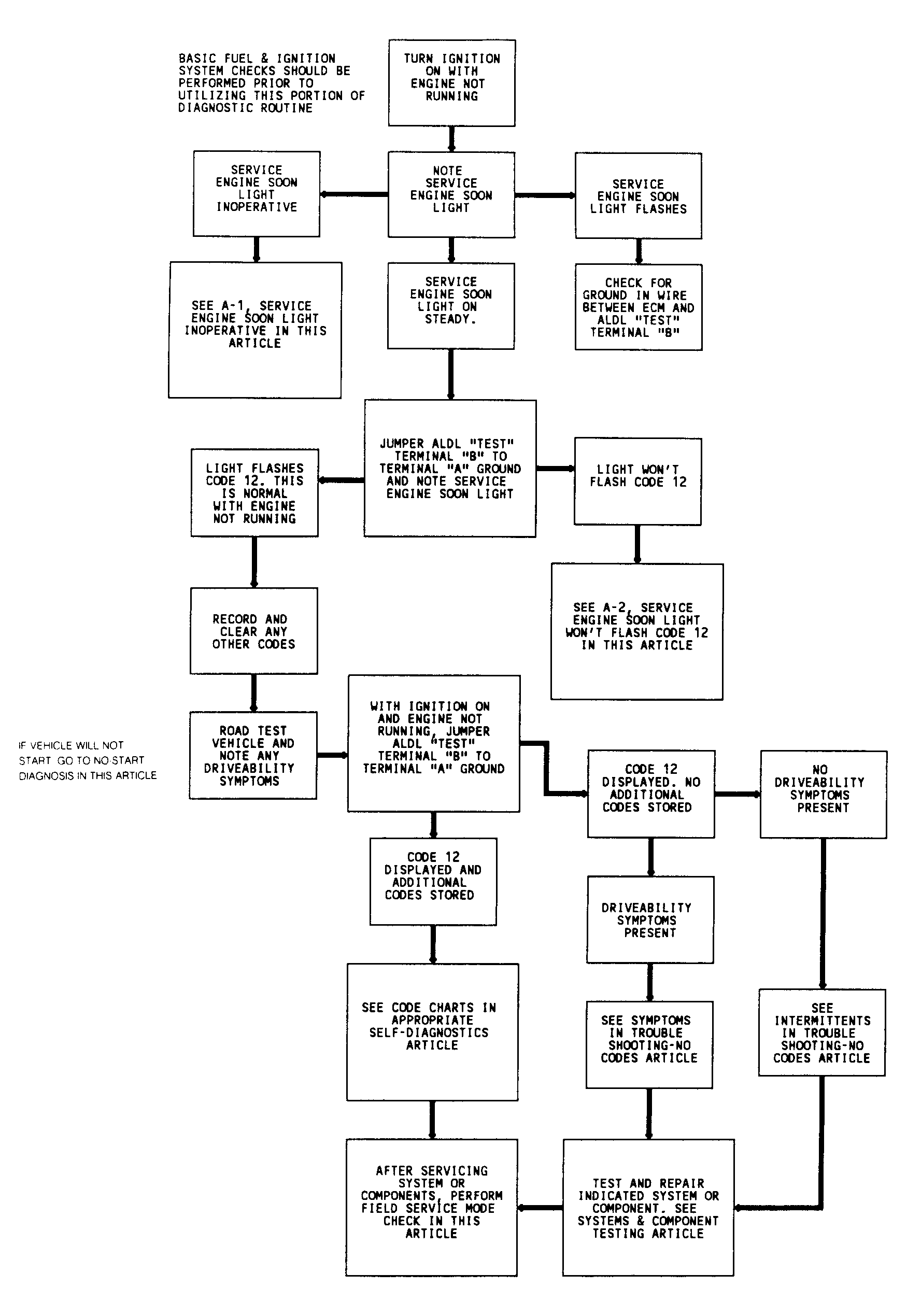- Grounding ALDL diagnostic test terminal "B" now should cause SERVICE ENGINE SOON light to flash a Code 12, followed by any codes stored in ECM memory. If light goes from bright to dim or if light remains on and does not flash Code 12, see A-2, SERVICE ENGINE SOON LIGHT ALWAYS ON OR WON'T FLASH CODE 12.