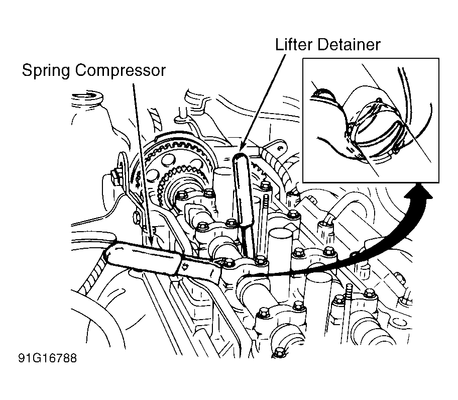 - Install Lifter Spring Compressor (J-39871-1) between camshaft and lifter to push lifter downward. See Fig 1 . Insert Lifter Detainer (J-39871-2) between camshaft and lifter. Ensure bottom edge of lifter detainer is positioned on lifter, not on adjuster shim. See Fig 1 . This will hold lifter away from camshaft.