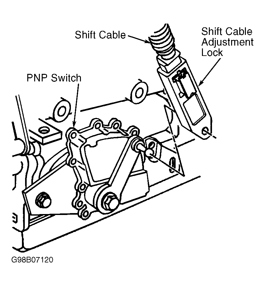Raise and suitably support the vehicle. Shift the transmission into NEUTRAL. Using a flat-bladed screwdriver, carefully pry to release the transmission shift control cable adjustment lock. See Figure . Check to be sure that the transmission floor shift control is in the NEUTRAL detent position. Check to be sure that the transmission is in the NEUTRAL detent position. Press to secure the transmission shift control cable adjustment lock. Lower the vehicle.