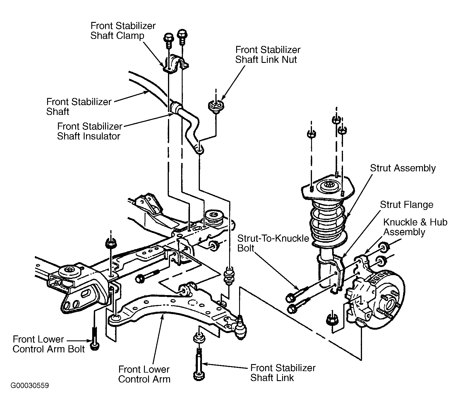 The front suspension is a strut and spring design with stabilizer bar. See Fig 1. Upper end of strut is attached to body with mount and bearing to allow for turning. Lower end of strut is attached to steering knuckle which pivots on lower control arm ball joint. The strut provides shock absorption and structural integrity.