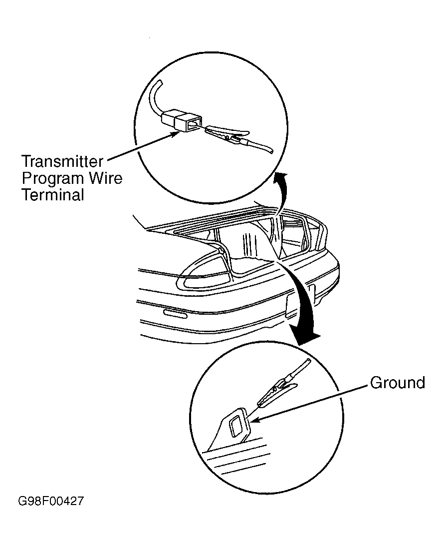- Open trunk lid. Remove right-side rear compartment trim. Using jumper wire with alligator clips, ground transmitter program wire terminal. Door locks will lock and unlock, indicating receiver is in program mode. See Fig 1 .