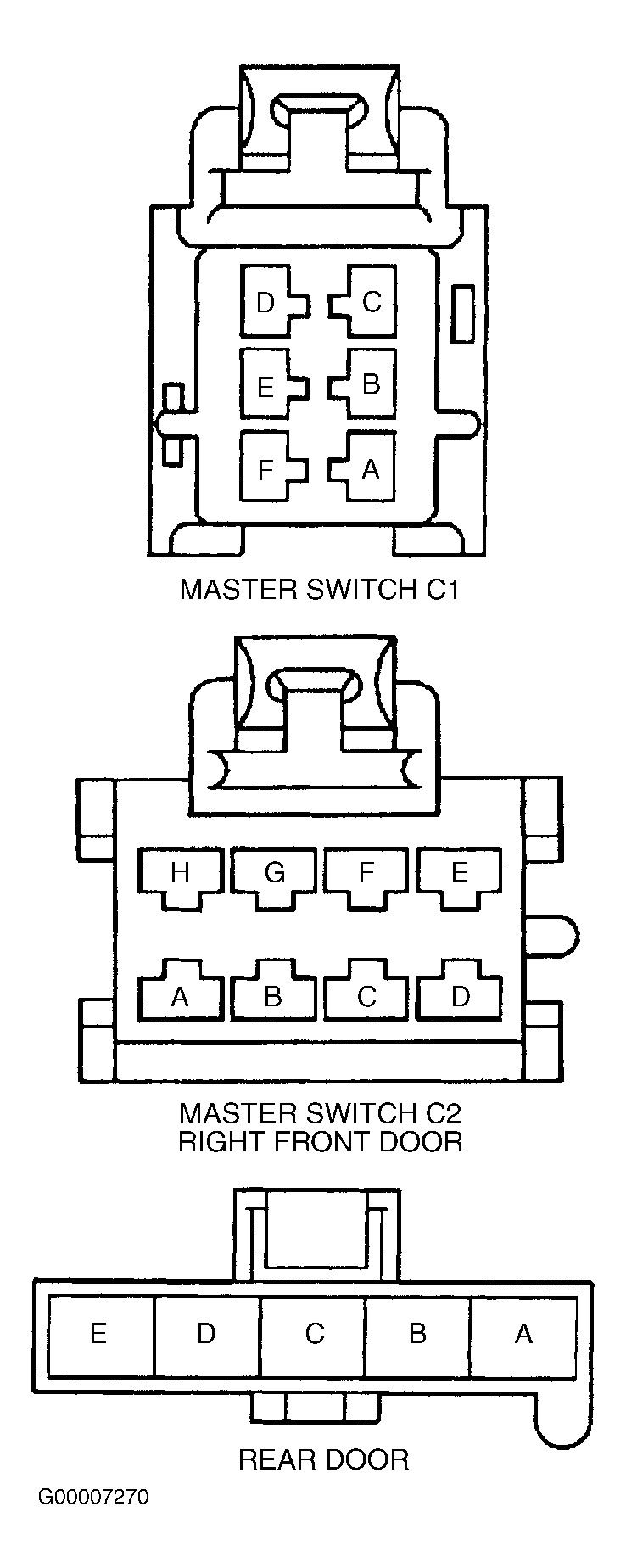 - Disconnect power window master switch 8-pin harness connector. Turn ignition switch to RUN position. Using test light connected to ground, probe power window master switch harness connector C1 terminal "D" (Dark Blue wire). See Figure . If test light does not illuminate, go to next step. If test light illuminates, go to step 3 .