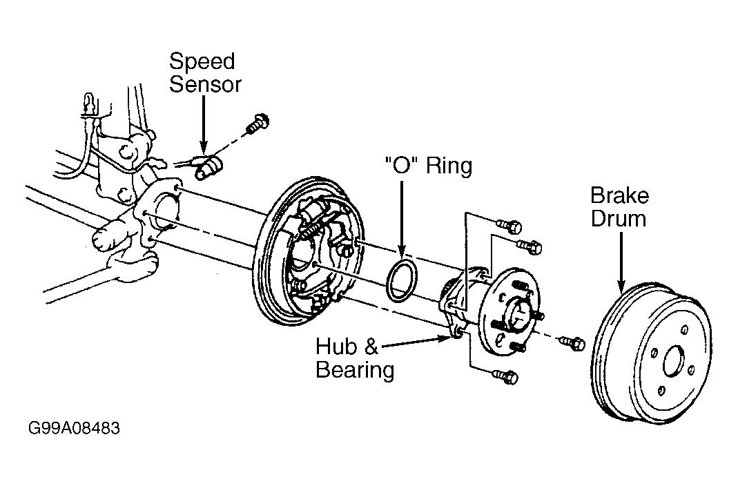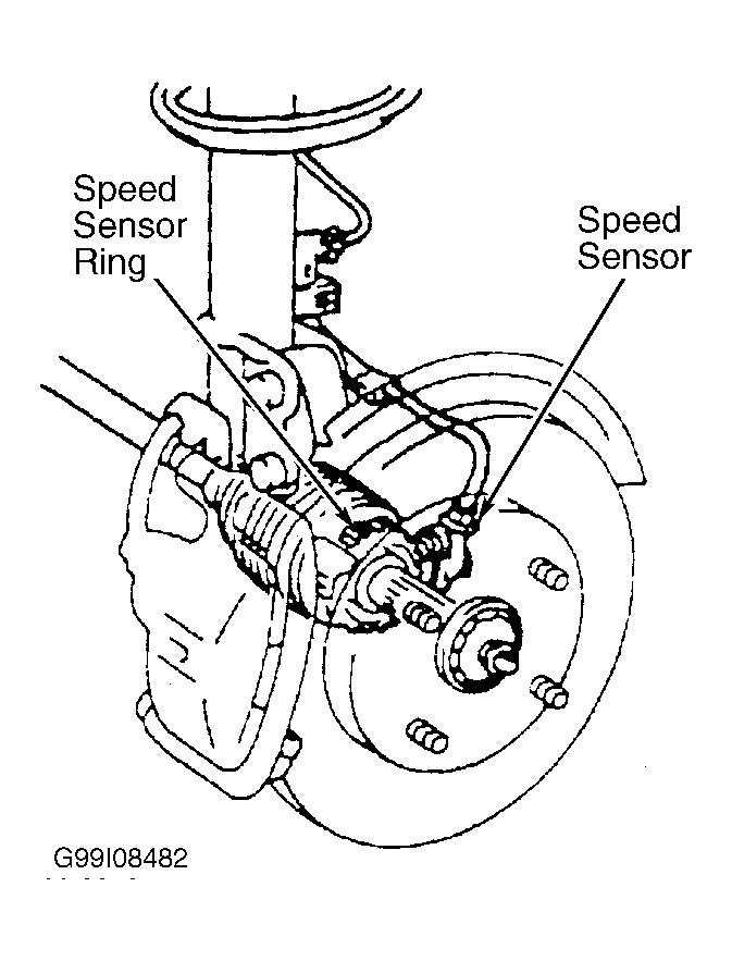 Front wheel speed sensors are attached to steering knuckles. Rear wheel speed sensors are mounted over a toothed sensor ring. See Fig 1 or Fig 2 . Air gap is not adjustable and sensor is not repairable. Front outside drive axle or rear hub and bearing assembly must be replaced if sensor ring is damaged.
