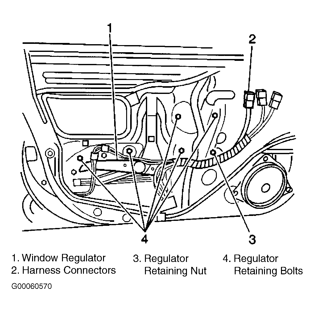 - Install window regulator (1) to door. Secure regulator with 5 bolts (4) and nut (3). Tighten regulator bolts and nut to 71 INCH lbs. (8 N.m). See Figure .