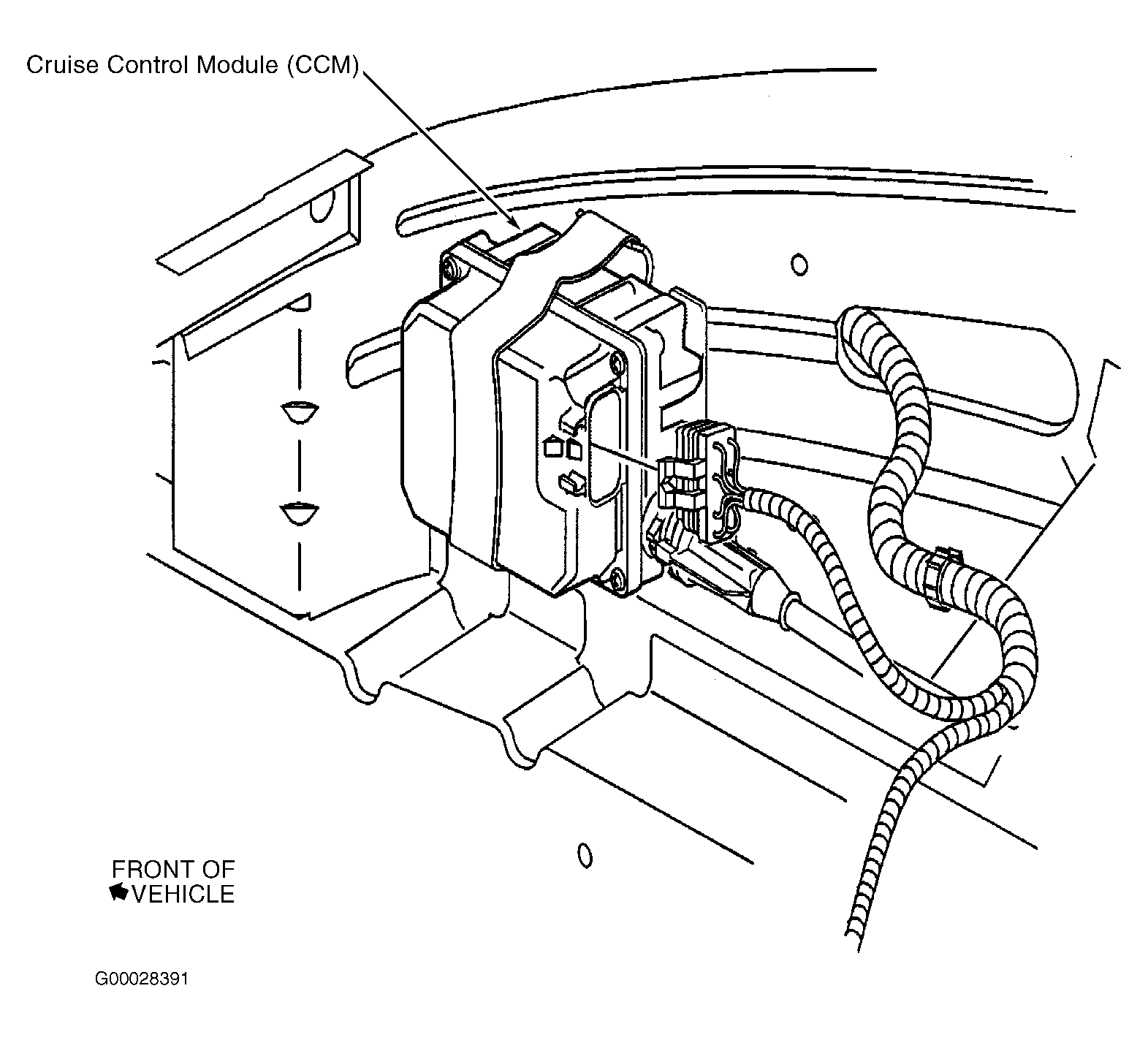| Cruise Control Module (CCM) | On right side of engine compartment. See Figure. |