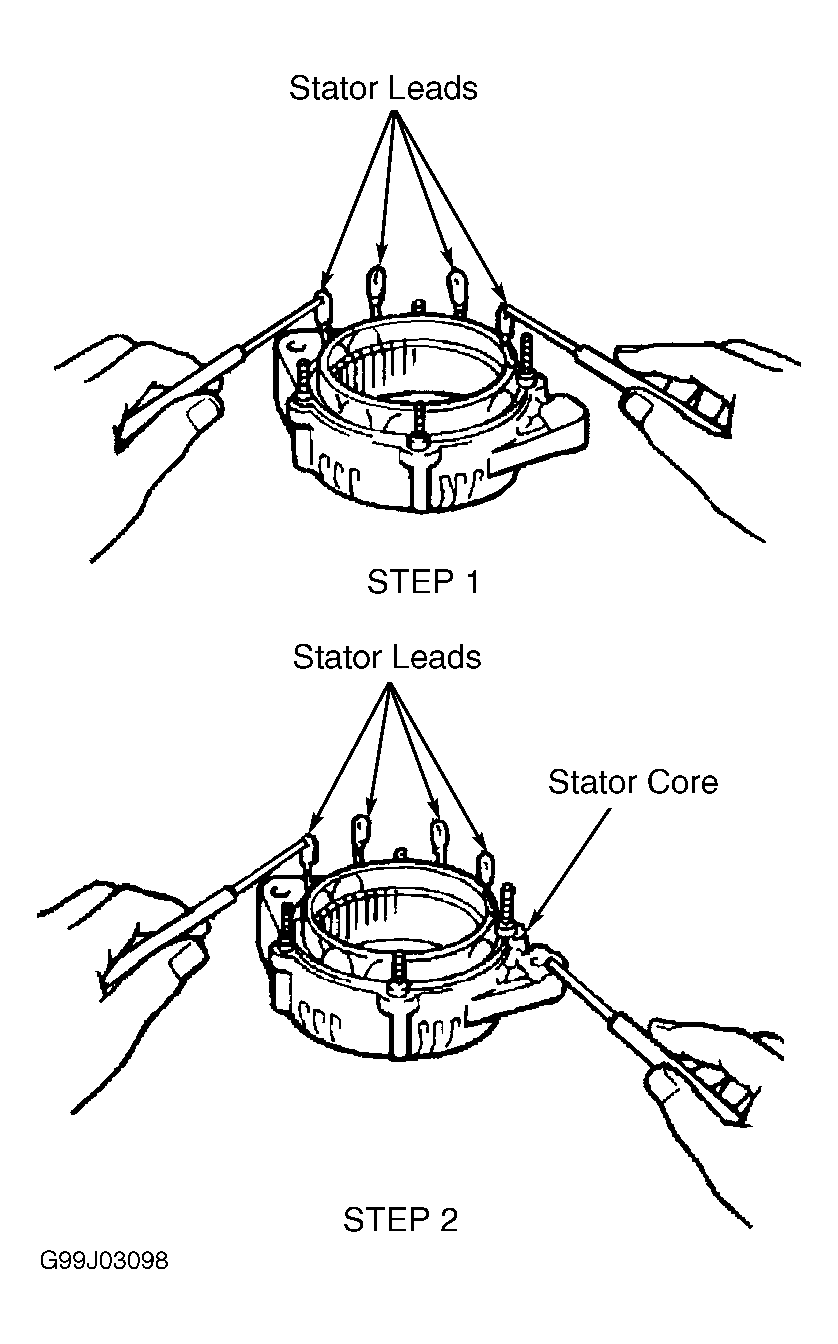 - Using an ohmmeter, measure resistance between each stator lead and stator core. Perform STEP 2 in figure. See Fig 1 . If resistance is less than 5 ohms, replace stator.