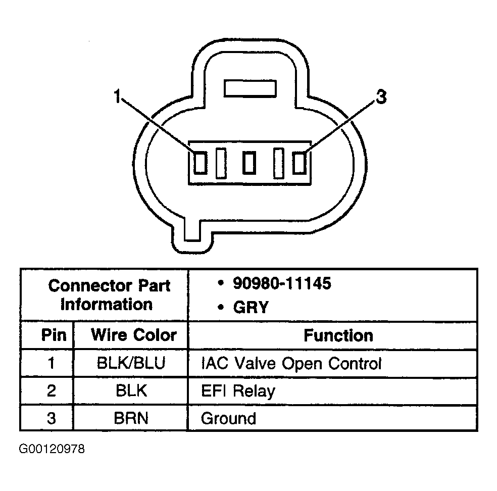 - Turn OFF the ignition. Disconnect the IAC valve electrical connector. Turn ON the ignition, with the engine OFF. Using a test lamp connected to ground, probe terminal No. 2 of the IAC valve connector on the harness side. See Figure . Does the test lamp illuminate? If yes, go to next step. If no, go to step 12 .