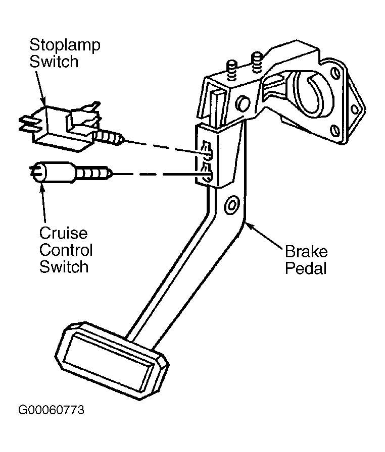 - Push the brake pedal forward in order to set the brake push rod into the booster. Pull the brake pedal to the rear, against the internal stop. The stoplamp switch and cruise control switch will be adjusted. Inspect the stoplamp for proper operation.
