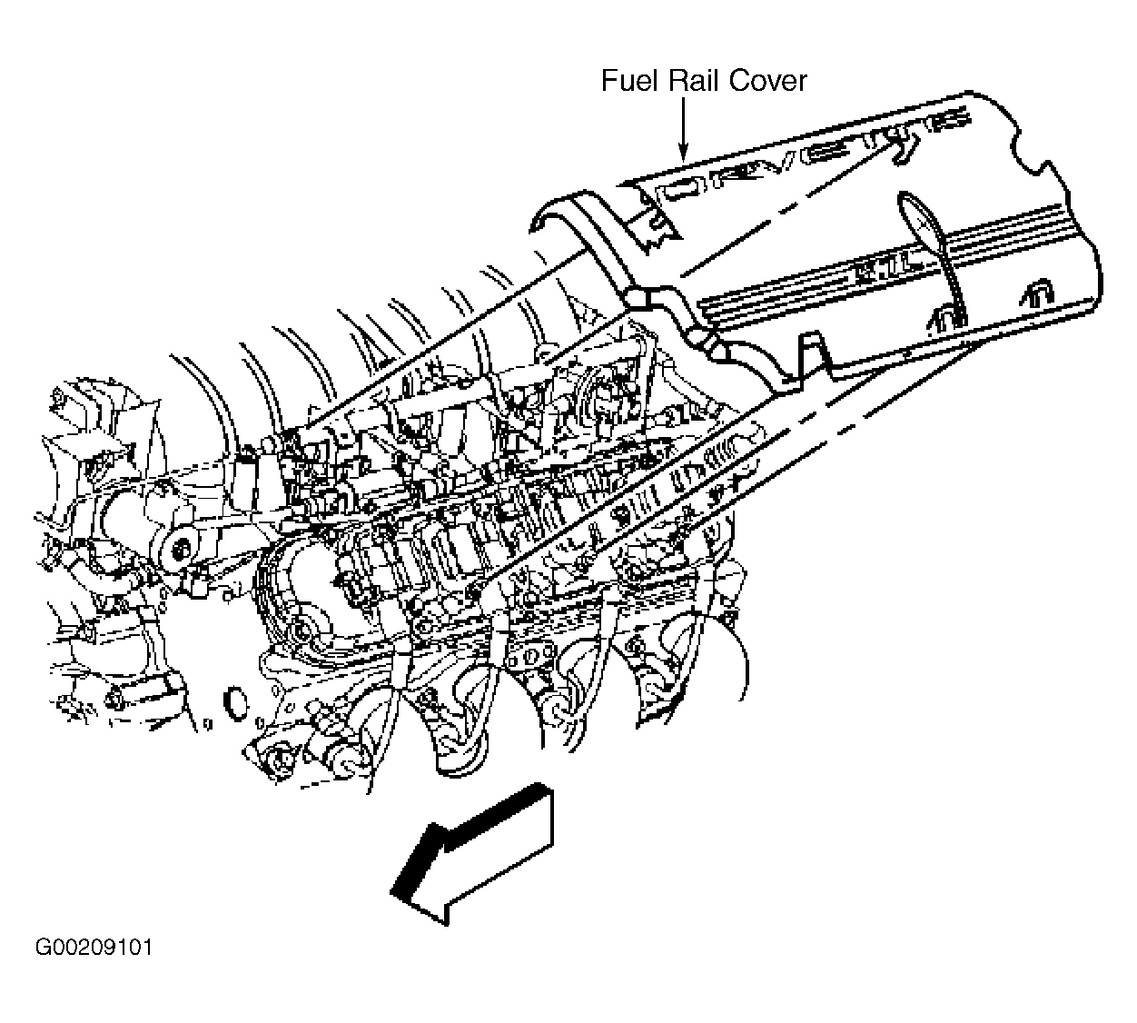 Turn ignition off. Disconnect the negative battery cable in order to avoid possible fuel discharge if an accidental attempt is made to start the engine. Loosen the fuel filler cap in order to relieve the fuel tank vapor pressure. Remove the left fuel rail cover See Fig 1 . Connect Fuel Pressure Gauge (J-34730-1A) to the fuel pressure connection. Wrap a shop towel around the fitting while connecting the gauge in order to avoid spillage. Install the bleed hose of the gauge into an approved container. Open the valve on the gauge to bleed the system pressure. The fuel connections are now safe for servicing. Drain any fuel remaining in the gauge into an approved container. Tighten the fuel filler cap.